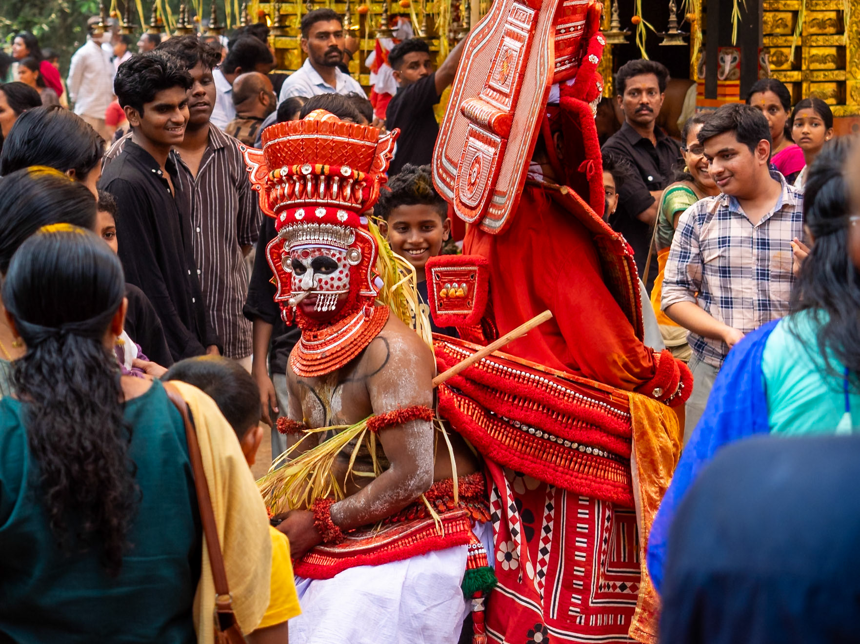 As for the specific meanings or stories being depicted, good luck. Just keep asking around, or enjoy the moment for what it is. We were always very welcome at the theyyam performances we saw, so long as you observe the niceties like removing shoes before entering temple grounds, embracing the sometimes chaotic crowd participation, & remembering that for some people this is their once a year chance to touch or speak to a god.